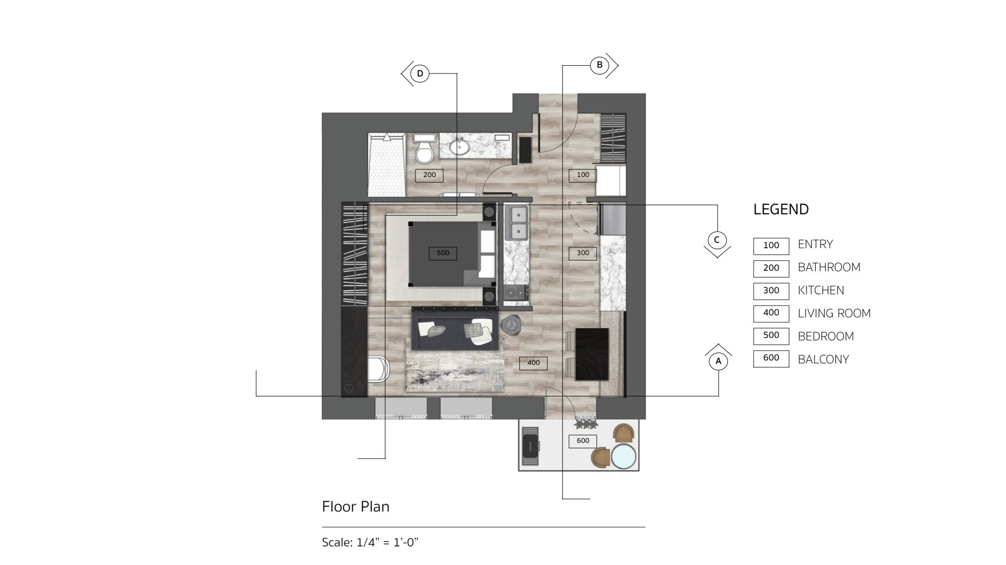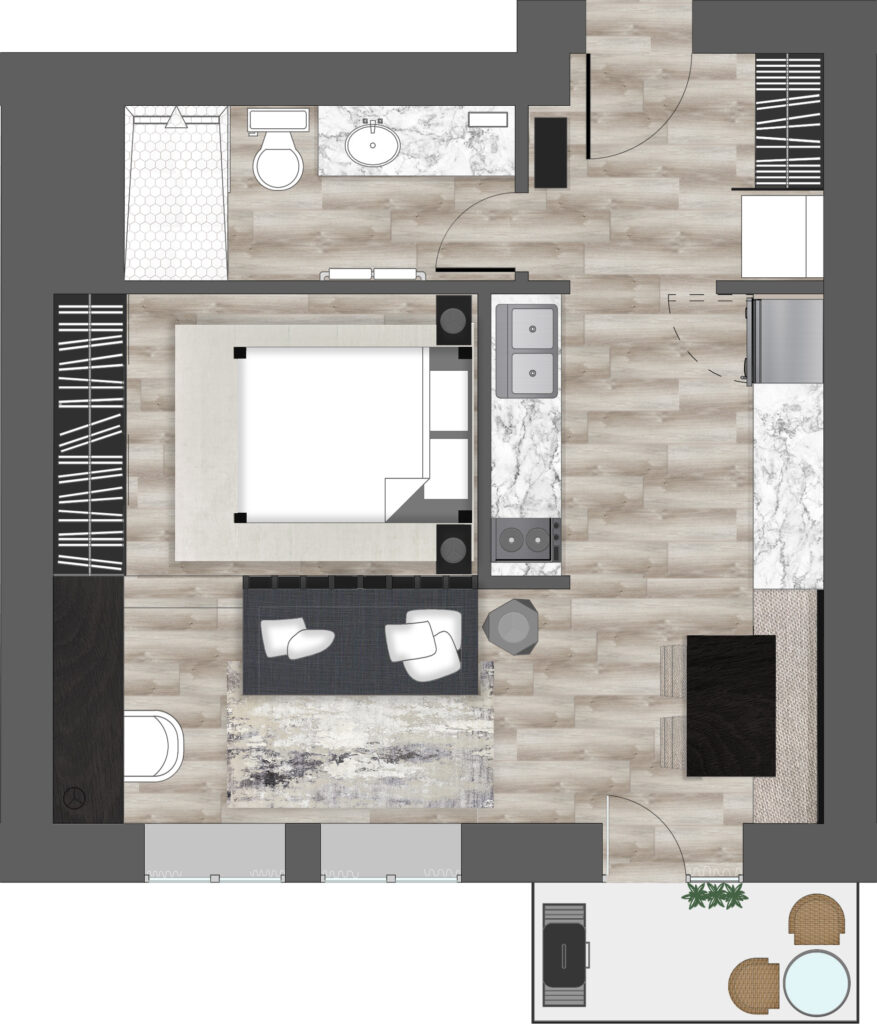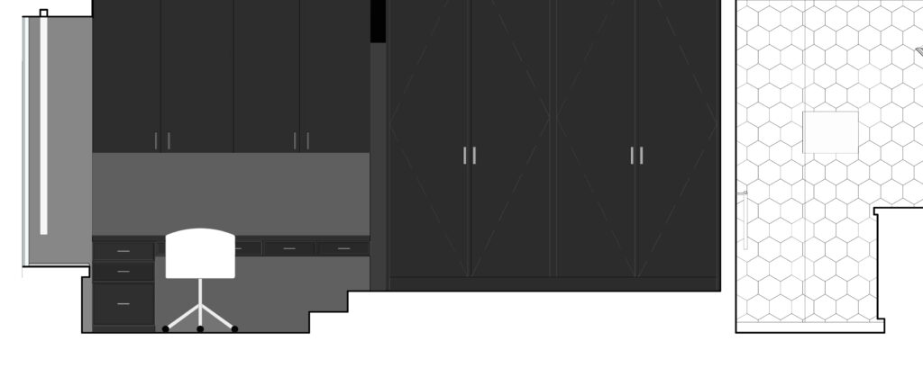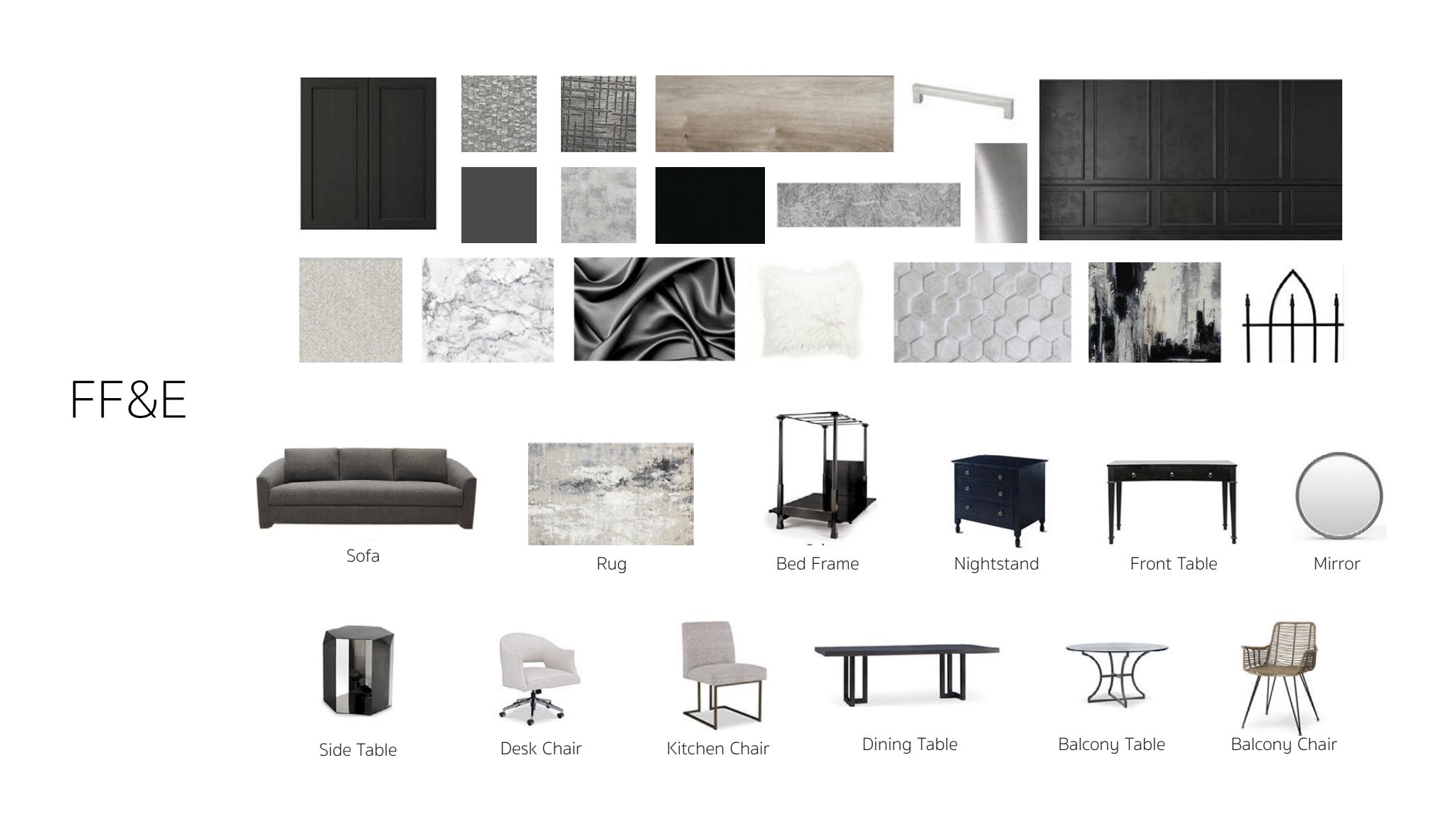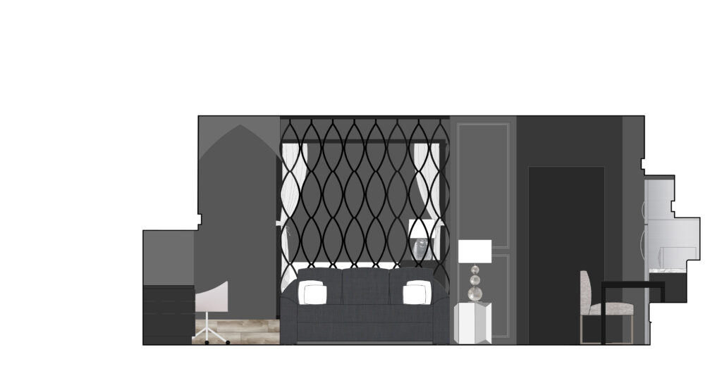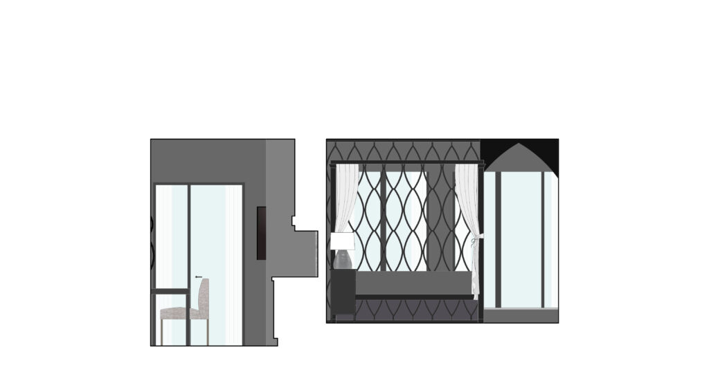 The goal of the project was to design a hotel suite in an existing Gothic architecture building, in a location of our choosing. The design style was luxurious noir, using Kravet brand furniture pieces.